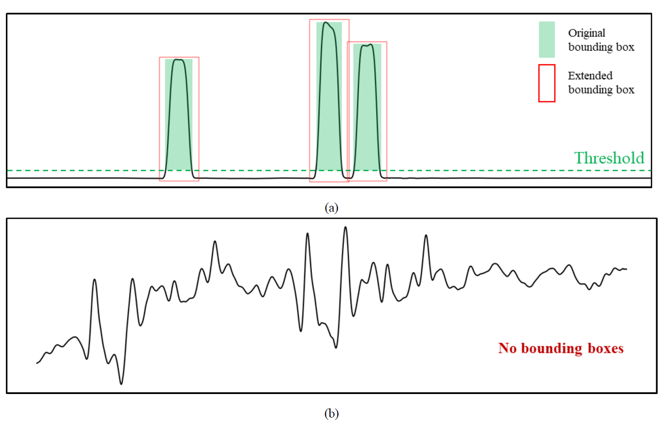 마지막은 탐지된 경계 상자 좌표를 역매핑하여 각 축 이벤트의 시작점과 종료점으로 변환된다. 이후 중복 영역 병합, 주변 노이즈 제거, 경계 보정 등