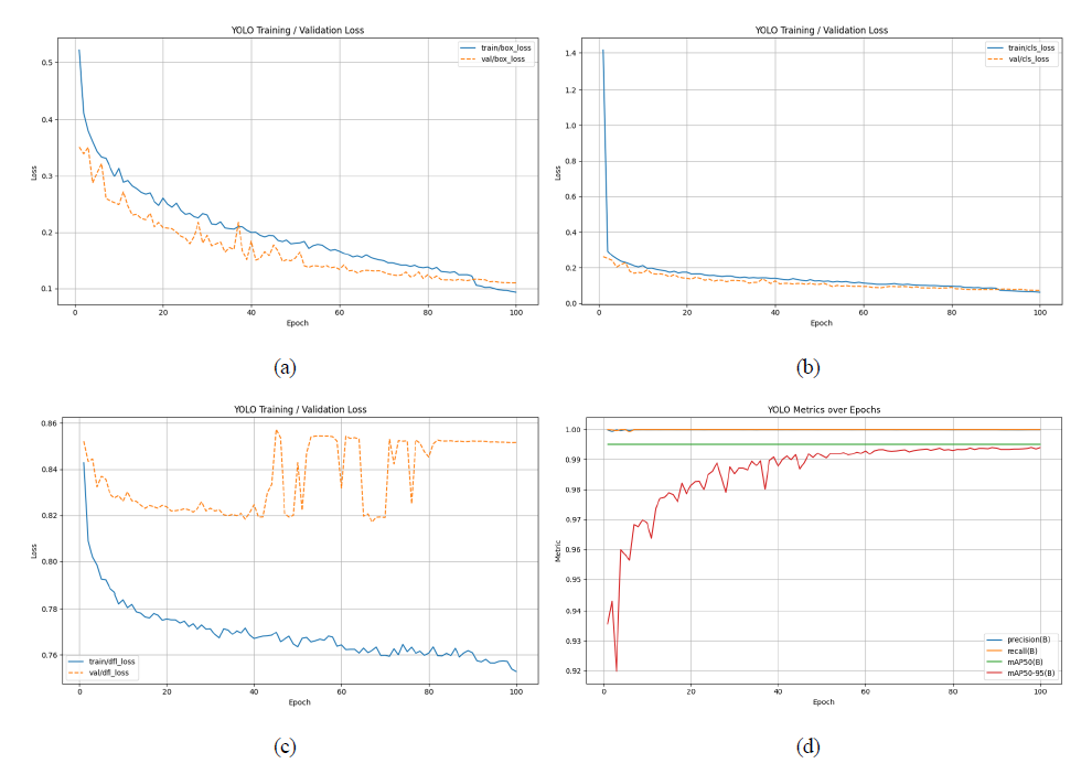 epoch 동안 학습되었으며, 학습 손실(train/box_loss, train/cls_loss, train/dfl_loss)은 각각 box_loss